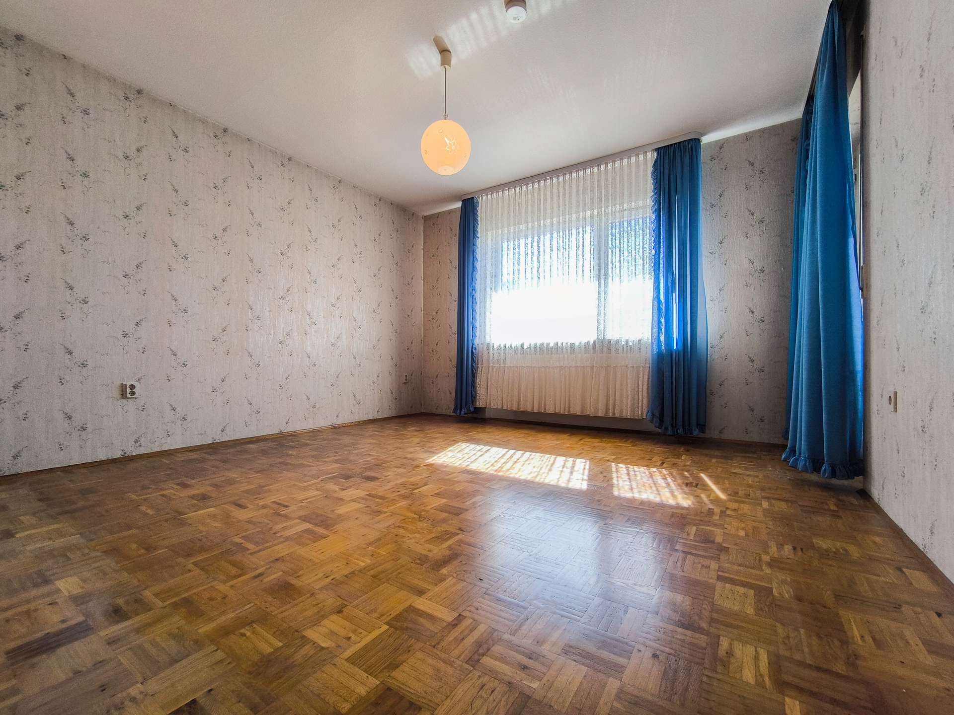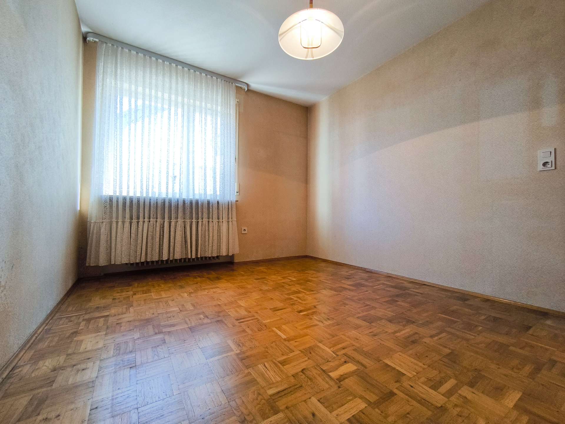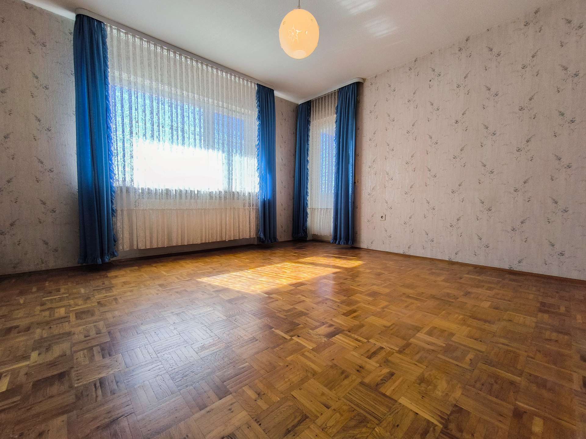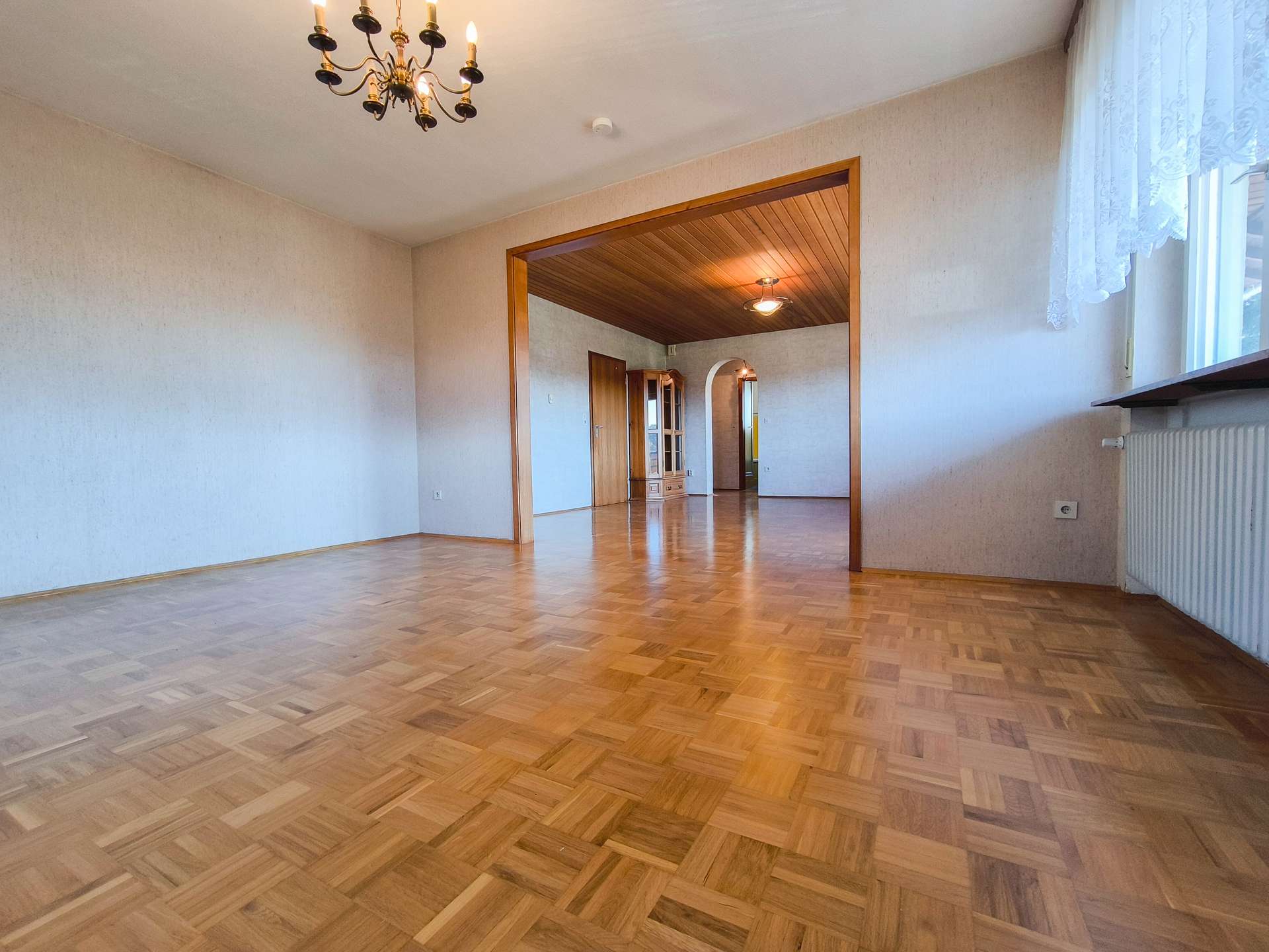 Das Haus verfügt über 6 Zimmer, darunter 3 geräumige Schlafzimmer und 1 Badezimmer. Die Ausstattung ist derzeit einfach, bietet aber zahlreiche Möglichkeiten zur Modernisierung und Individualisierung. Die Böden sind mit einer Kombination aus Parkett und Fliesen versehen, die eine warme und praktische Atmosphäre schaffen.