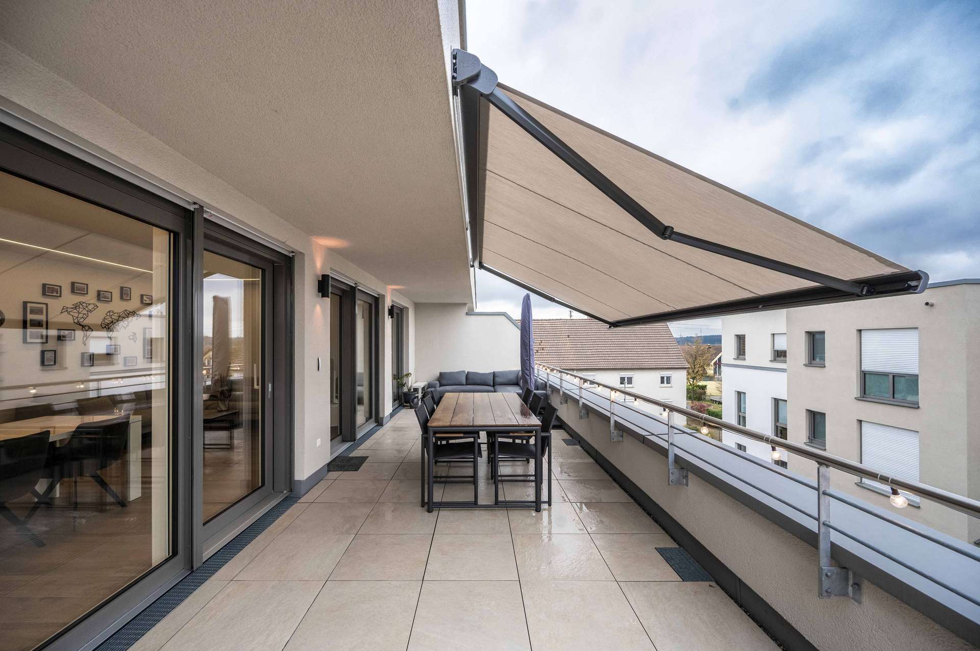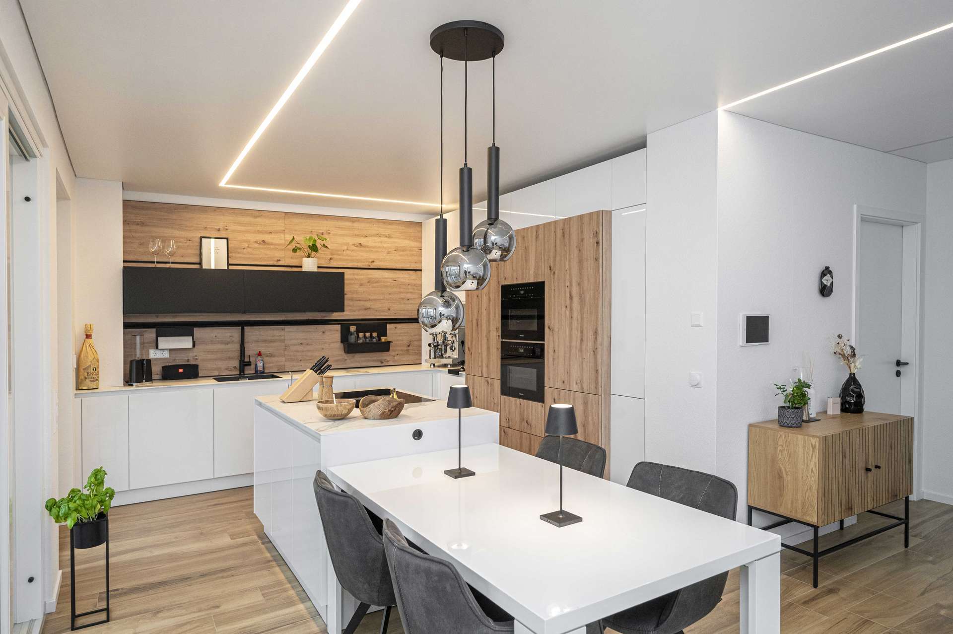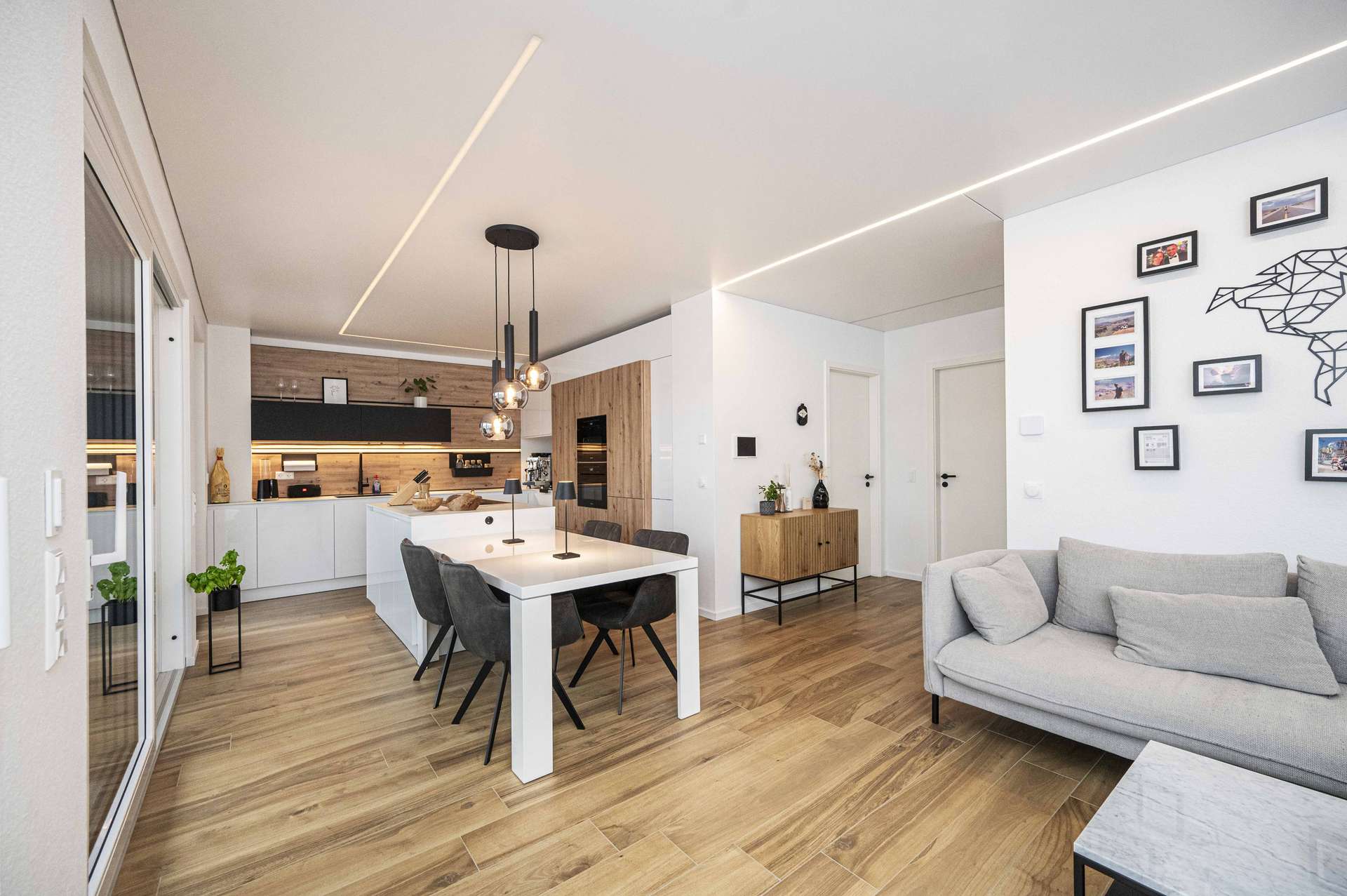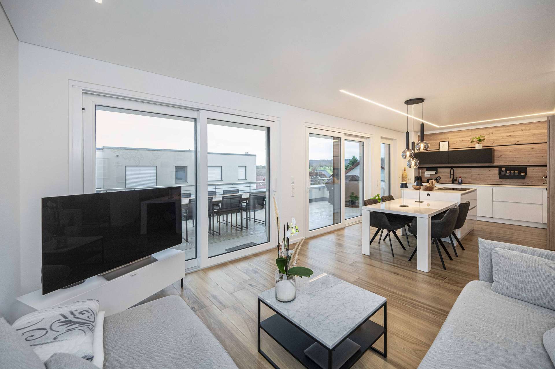Das Penthouse selbst beeindruckt mit einem modernen und ansprechenden Design. Große Fensterflächen ermöglichen einen herrlichen Ausblick auf die umliegende Landschaft und sorgen