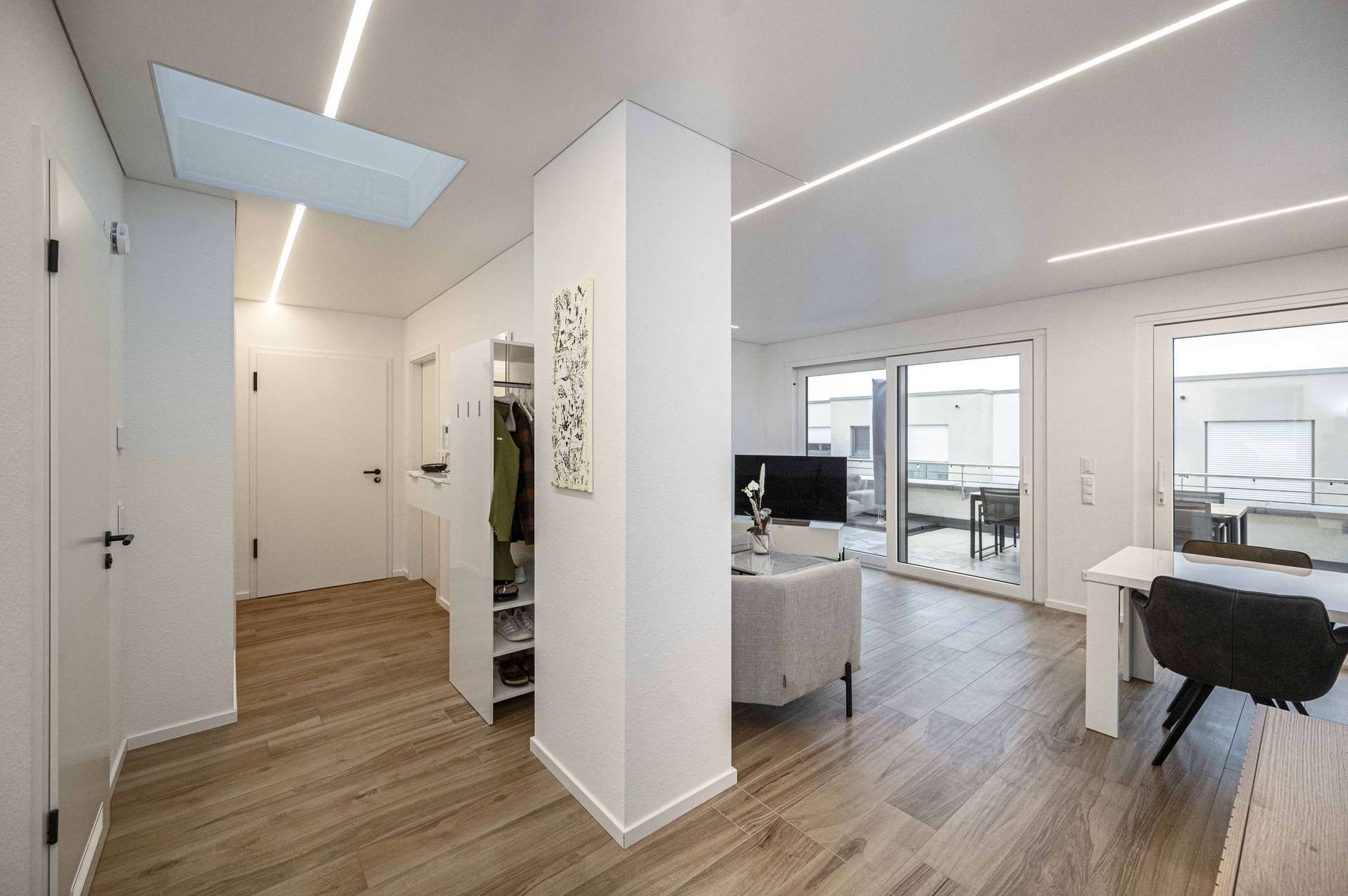 Genießen Sie die Vorzüge eines Penthouse-Wohnens und lassen Sie sich von dem großzügigen Wohnbereich mit offener Küche begeistern. Von hier aus gelangen Sie auf die einladende Dachterrasse, auf der Sie gemütliche Stunden im Freien verbringen können. Die Schlafzimmer