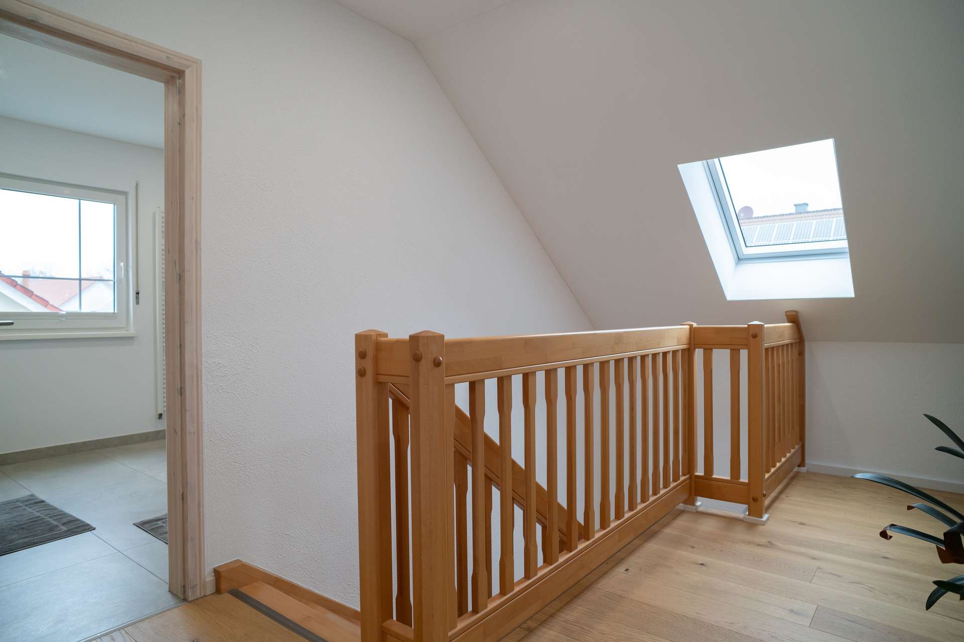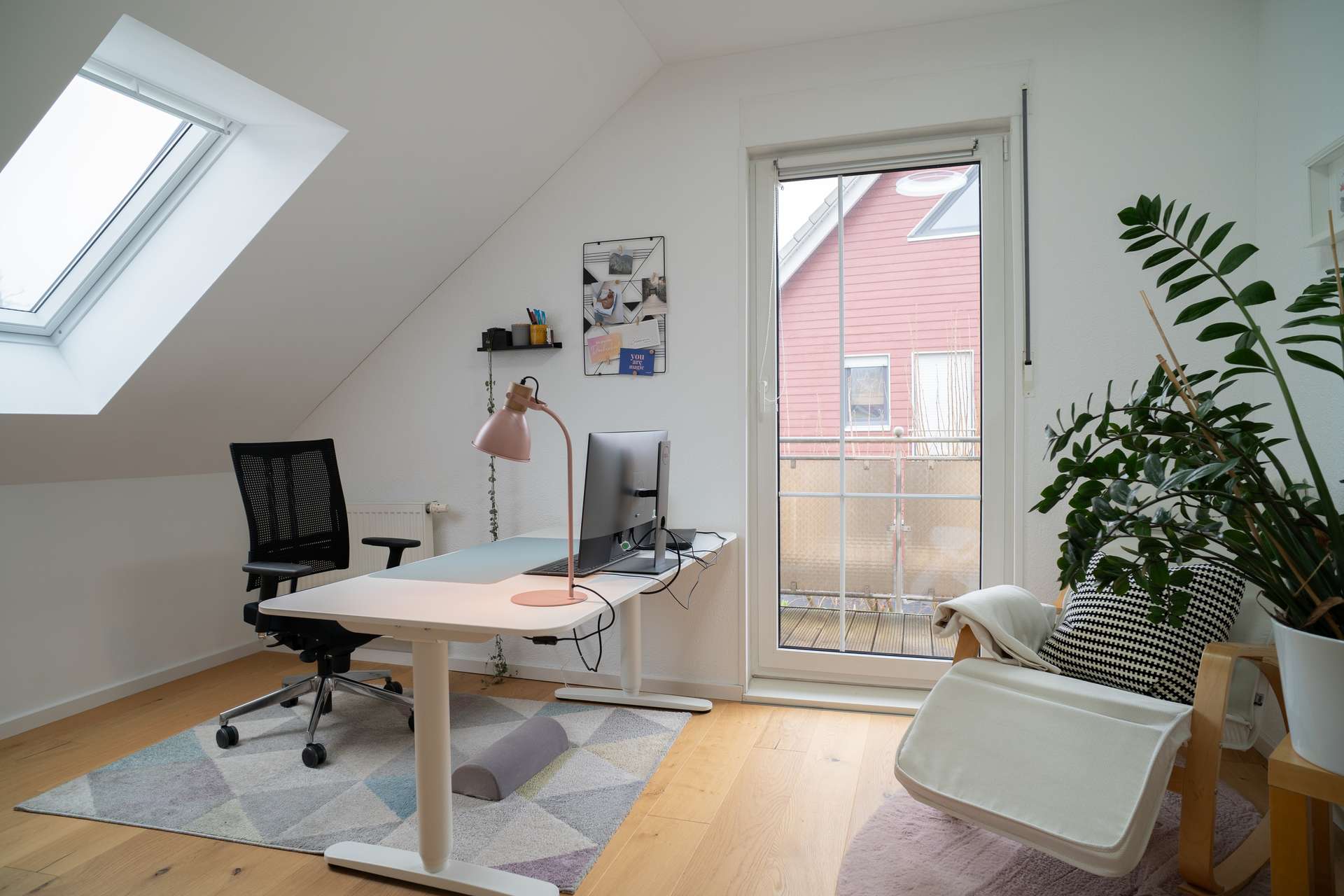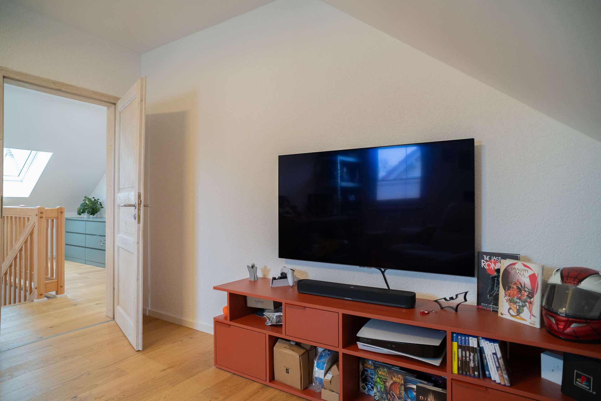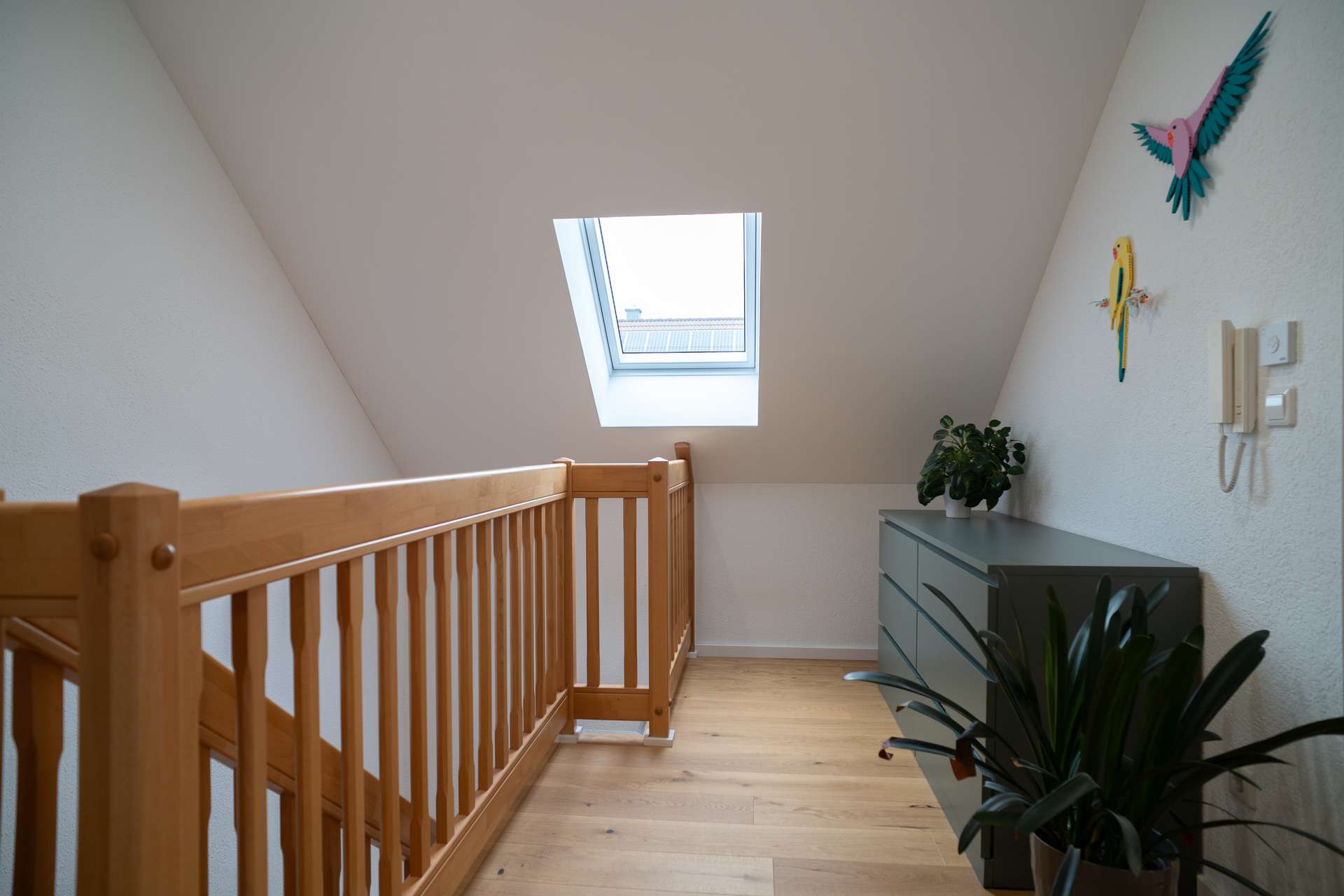 Im Dachgeschoss, das 2023 komplett renoviert wurde, erwarten Sie drei helle Räume, die flexibel als Schlafzimmer, Kinderzimmer und Büro genutzt werden können. Neue Velux‑Dachfenster mit Solarrollladen fluten zusätzlich die Räume mit Licht und sorgen für ein angenehmes Wohngefühl. Das große Tageslichtbad aus 2024 beeindruckt mit Unterputzarmaturen an Waschbecken und Badewanne sowie großzügiger Regendusche. Vom Schlafzimmer und dem Büro gelangen Sie direkt auf den Balkon – ein perfekter Ort, um den Tag bei Sonnenaufgang zu beginnen.