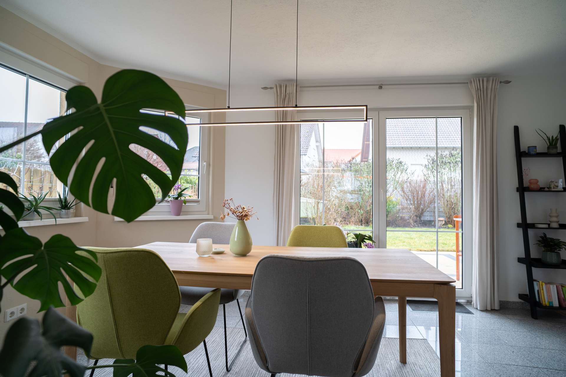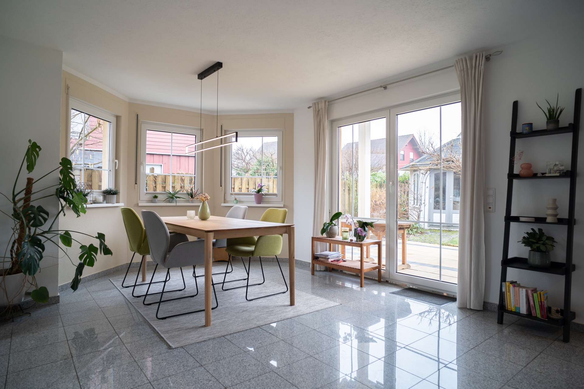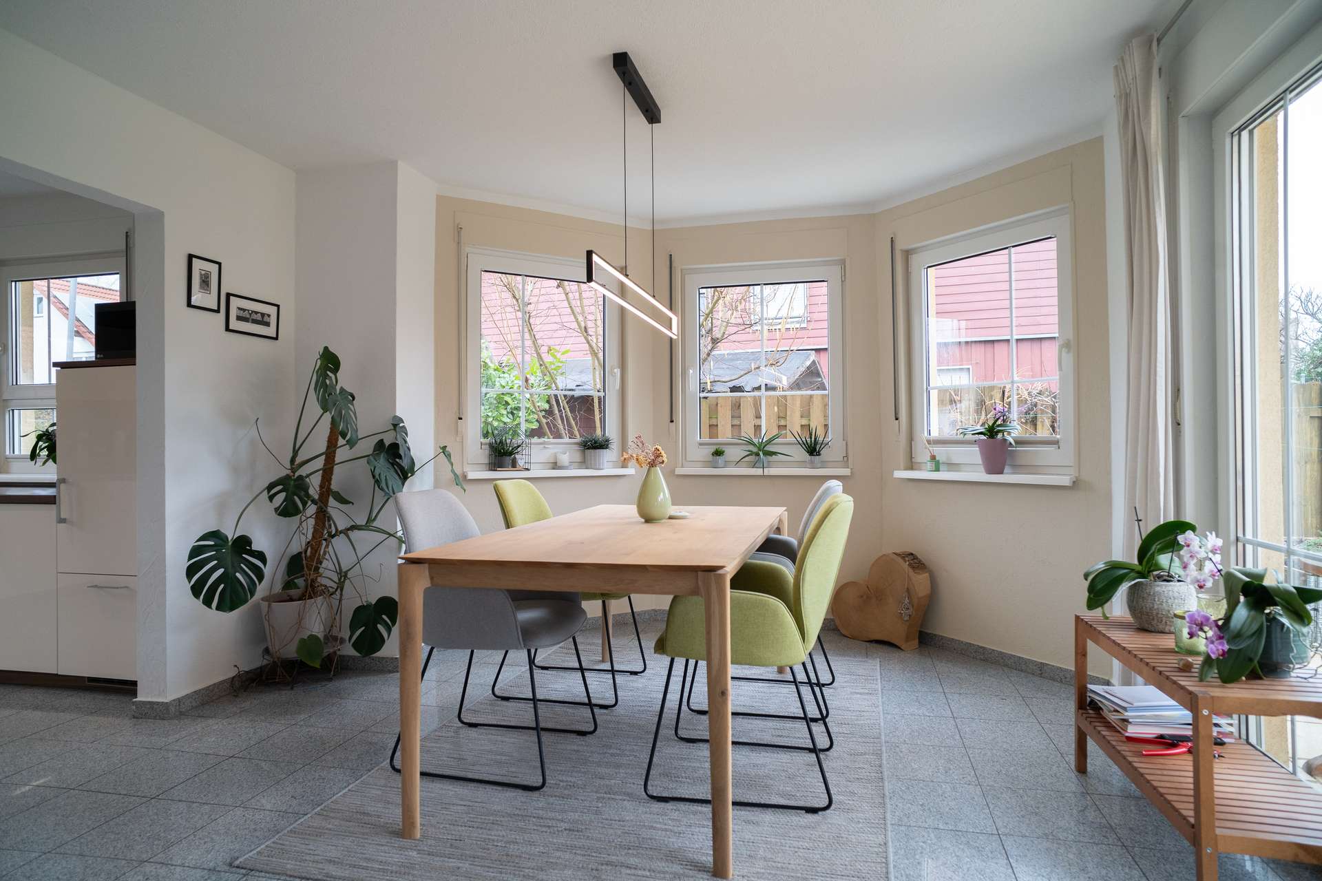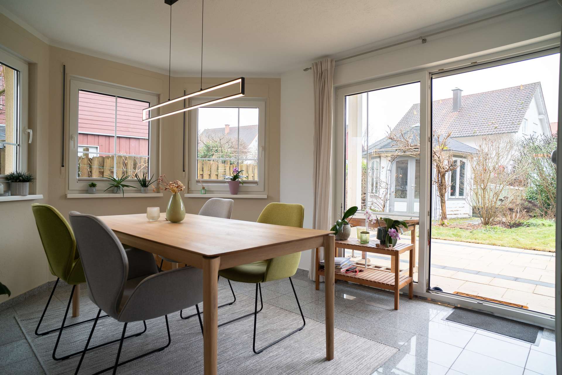 Beim Betreten empfängt Sie eine großzügige Diele, die in den lichtdurchfluteten Wohn‑ und Essbereich führt. Große Fenster und der direkte Zugang zur sonnigen Süd‑Terrasse schaffen eine offene, freundliche Atmosphäre und verbinden das Innere harmonisch mit dem gepflegten Garten, in dem Pavillon, Holzlagerplatz und Geräteabstellraum für zusätzlichen Komfort sorgen.