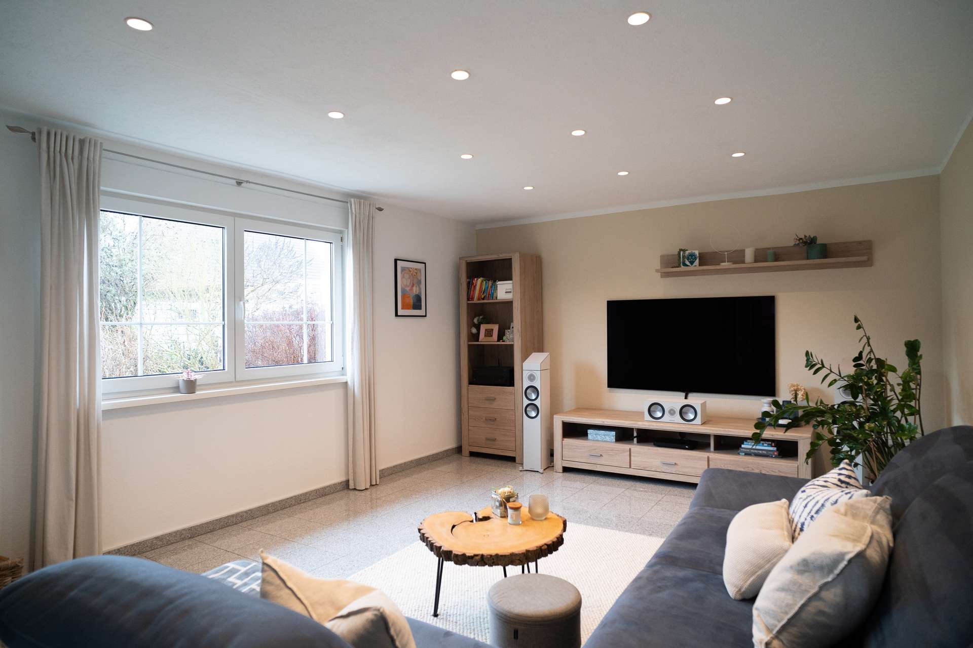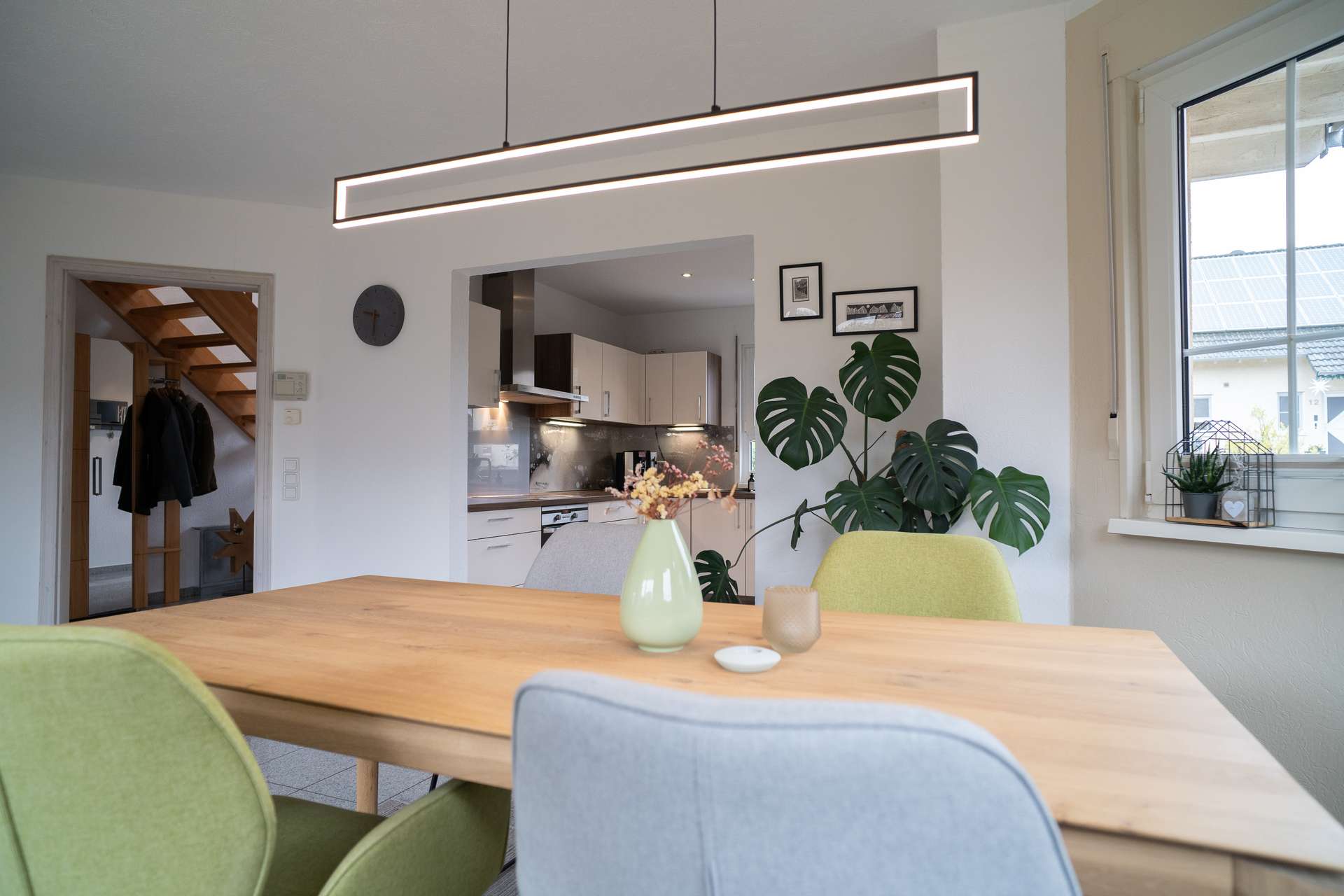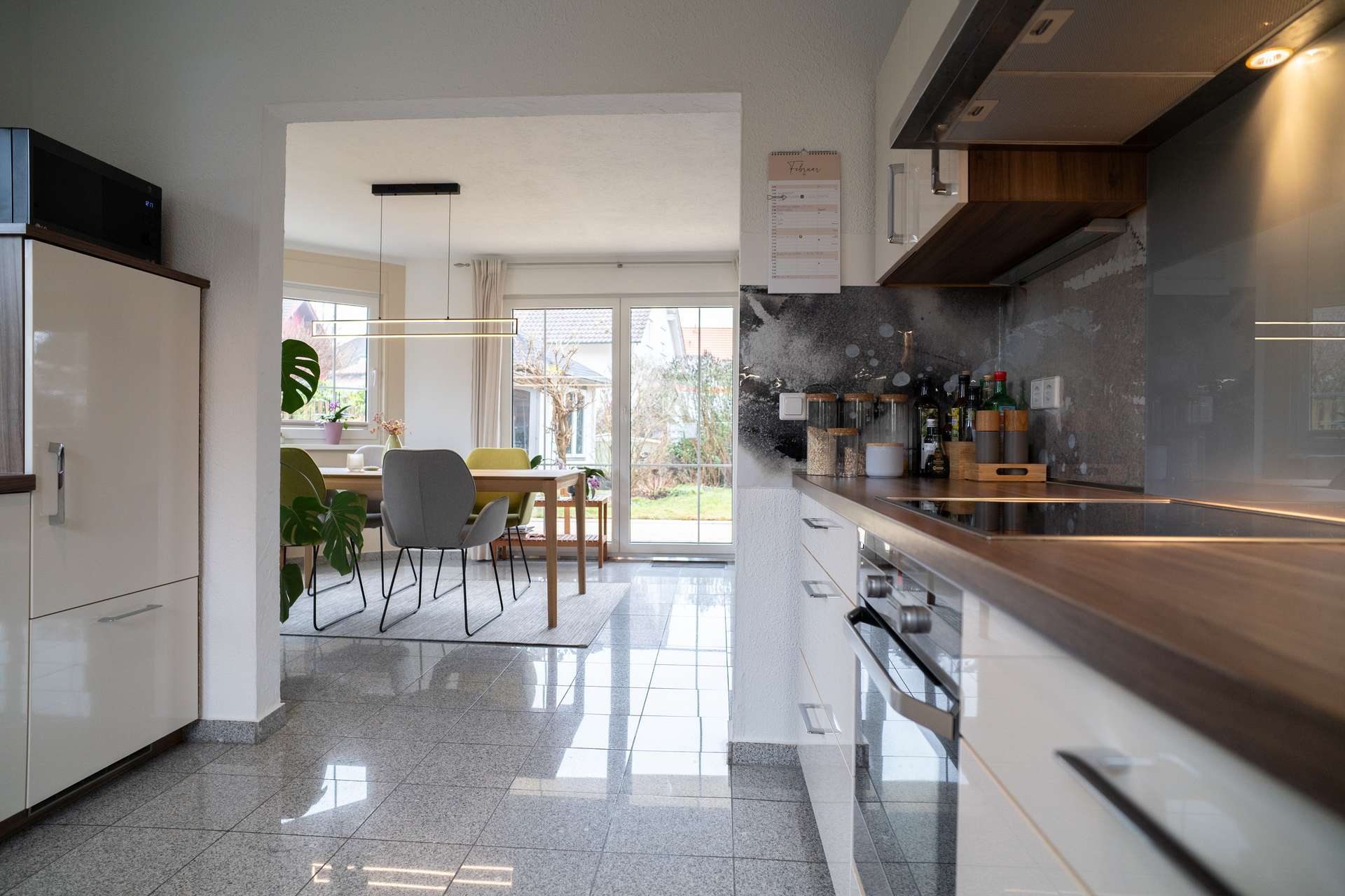 Beim Betreten empfängt Sie eine großzügige Diele, die in den lichtdurchfluteten Wohn‑ und Essbereich führt. Große Fenster und der direkte Zugang zur sonnigen Süd‑Terrasse schaffen eine offene, freundliche Atmosphäre und verbinden das Innere harmonisch mit dem gepflegten Garten, in dem Pavillon, Holzlagerplatz und Geräteabstellraum für zusätzlichen Komfort sorgen.