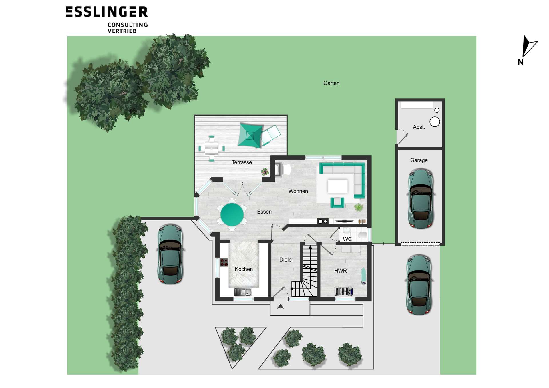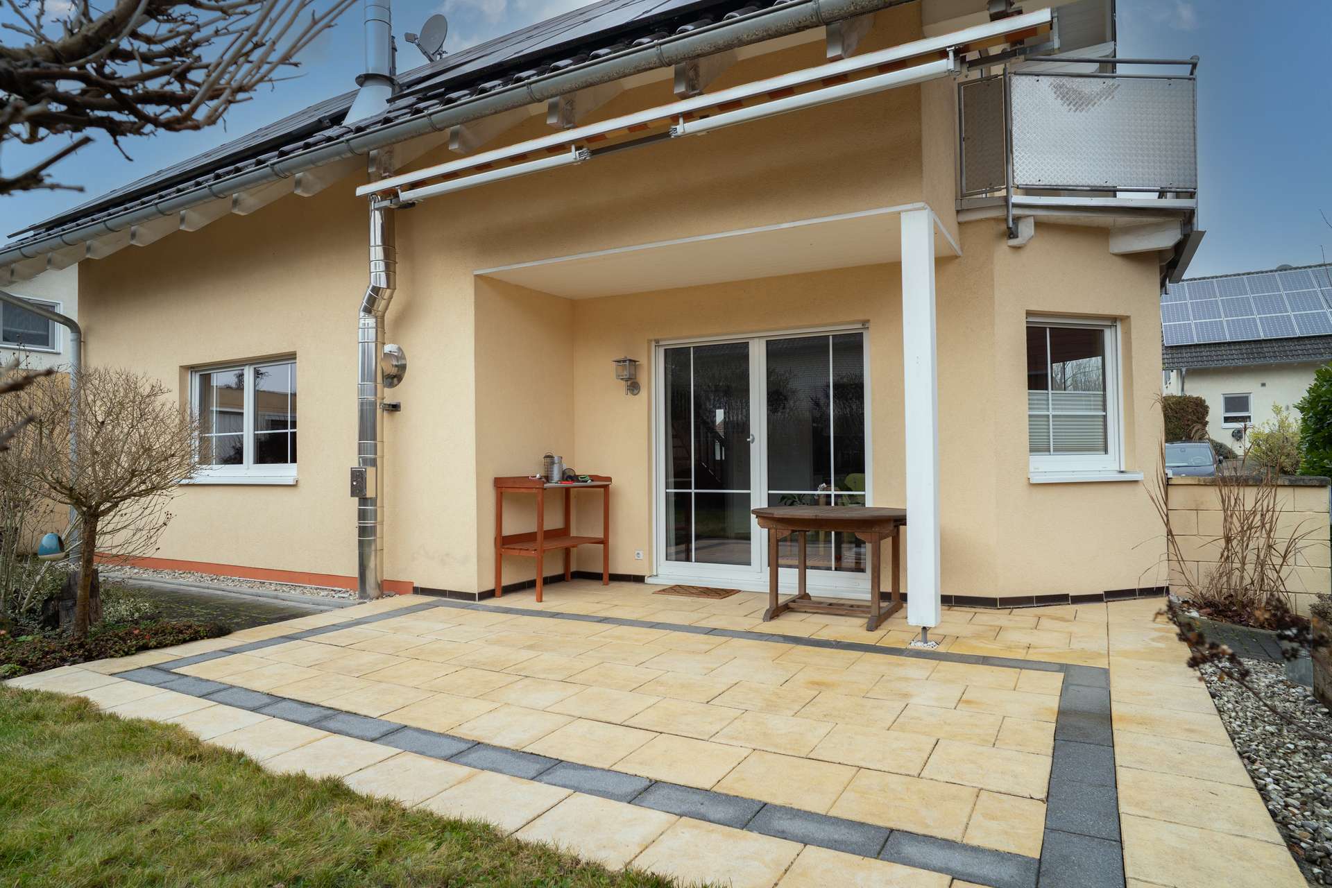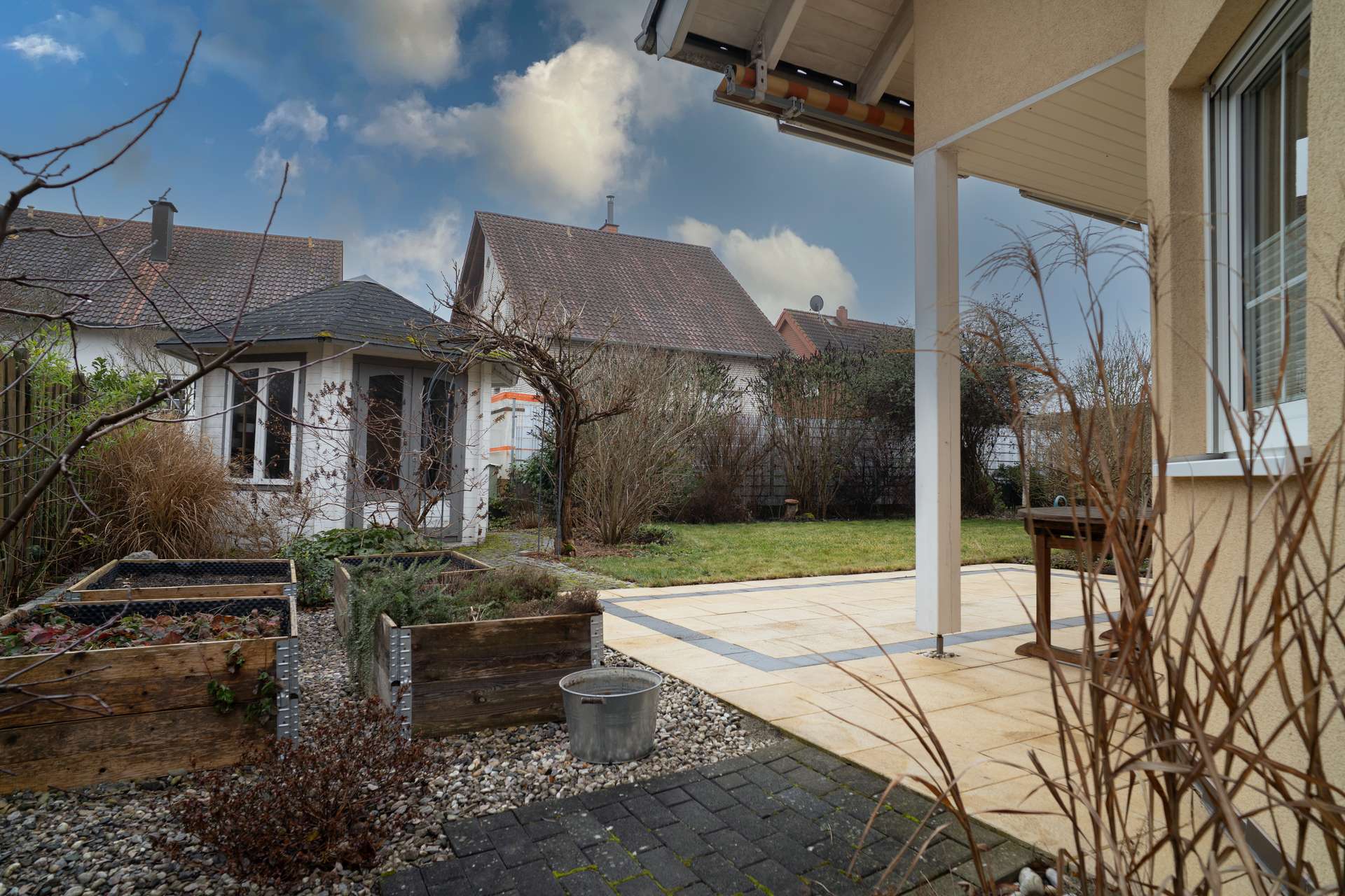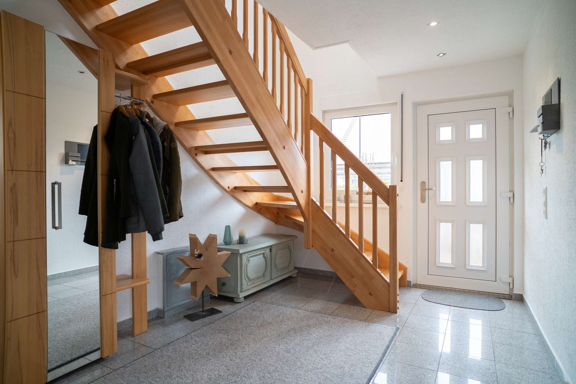 Beim Betreten empfängt Sie eine großzügige Diele, die in den lichtdurchfluteten Wohn‑ und Essbereich führt. Große Fenster und der direkte Zugang zur sonnigen Süd‑Terrasse schaffen eine offene, freundliche Atmosphäre und verbinden das Innere harmonisch mit dem gepflegten Garten, in dem Pavillon, Holzlagerplatz und Geräteabstellraum für zusätzlichen Komfort sorgen.