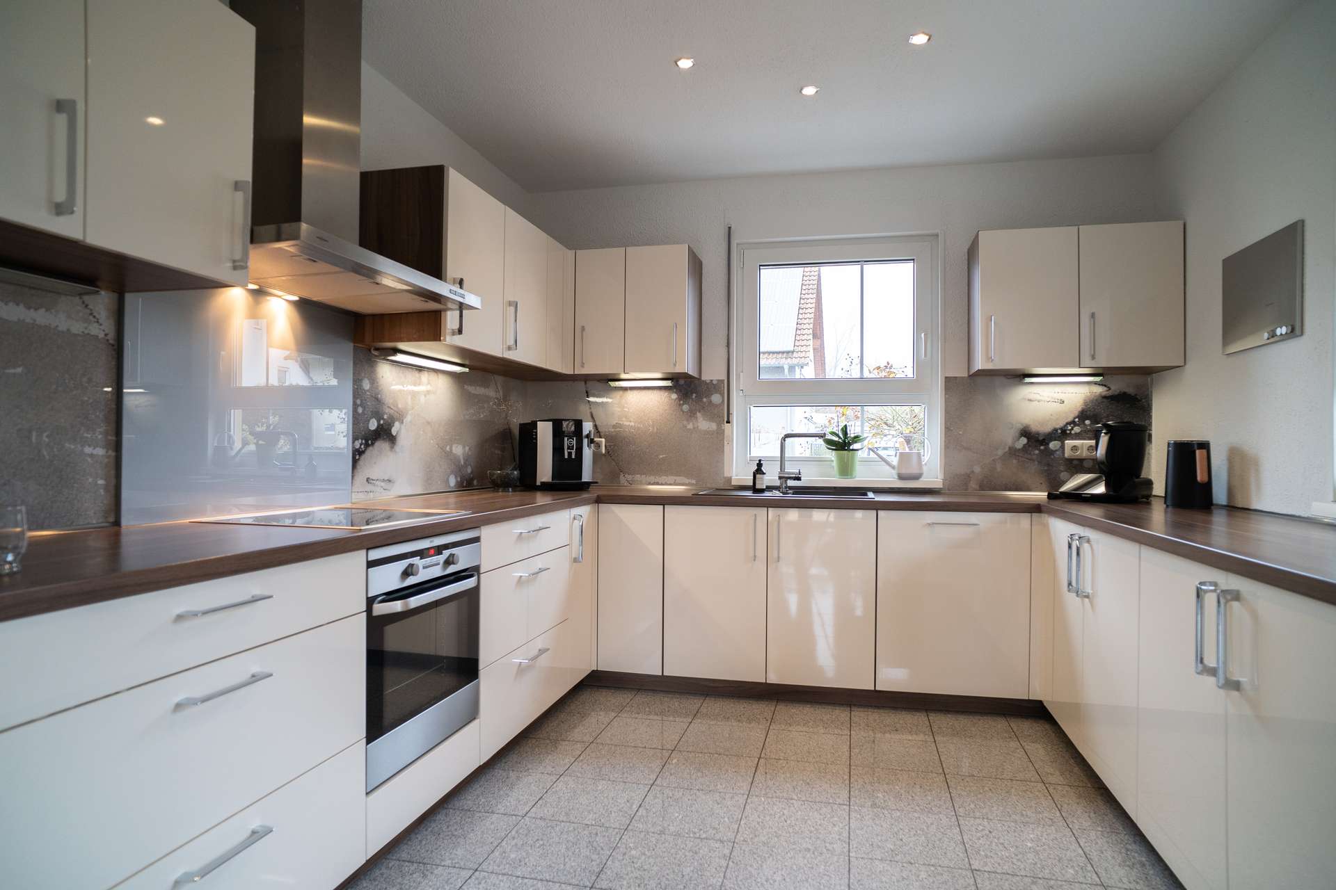 Die moderne, großzügige Einbauküche ist offen, aber klar vom Wohnbereich abgegrenzt – ideal für geselliges Kochen mit Familie oder Freunden. Ein Hauswirtschaftsraum mit Waschmaschinenanschluss sowie ein Gäste‑WC runden das Erdgeschoss ab. Für wohlige Wärme sorgt im Wohnbereich zudem ein Kaminofen. Die Fußbodenheizung garantiert höchsten Wohnkomfort auf dem robusten, langlebigen Granitboden.