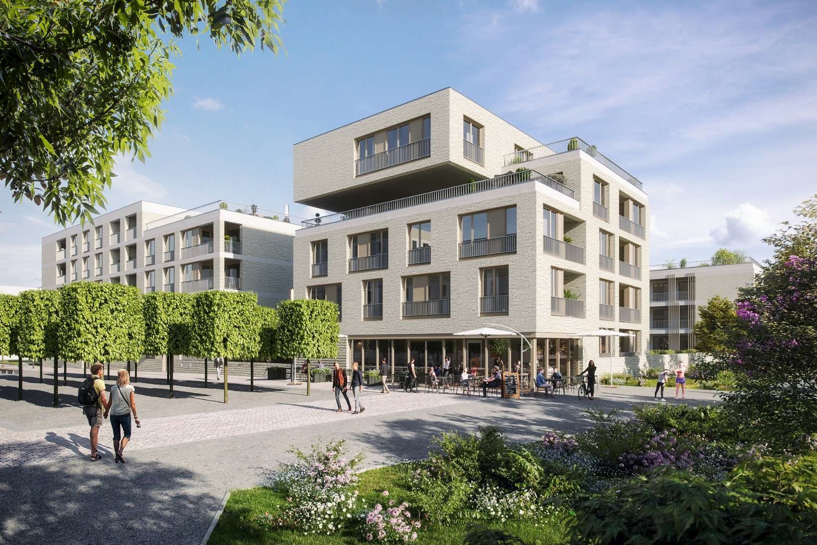 Der Zugang zum lebendigen Quartiersplatz mit Aufenthaltsflächen lädt zu Begegnung und Geselligkeit ein. Einkaufsmöglichkeiten des täglichen Bedarfs, Bäckereien, Bistros sowie weitere Versorgungsangebote befinden sich in direkter Nähe.